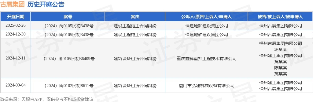 案号:(2024)闽0105民初3438号审理法院:福州市马尾区人民法院案由:建设工程施工合同纠纷当事人信息: 原告/上诉人:福建地矿建设集团公司 被告/被上诉人:福州古厝集团有限公司开庭日期:2025年2月26日根据统计,近一年内以福州古厝集团有限公司为当事人的历史开庭公告有4则,其中案由为“建筑设备租赁合同纠纷”的公告以2则居首,其次为“建设工程施工合同纠纷”有2则。历史开庭公告如下: